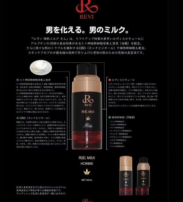 REVI 陶肌ミルクオム 内容量:50ml 1プッシュで2種類の(ミルク状美容液&透明美容液)が出るミルク美容液 容器上部のミルク状美容液には、9種類の植物幹細胞とルヴィスピキュール 容器下部の透明美容液には、ヒト神経幹細胞とCBD 2種類の美容液が使用直前のプッシュされるまで鮮度を保っています! ■延髄幹細胞 アルブチンの10倍のホワイトニング効果 皮膚深部まで成分を届けコラーゲン・エラスチンの生成を促す ■CBD(カンナビジオール) 抗酸化作用/抗糖化作用/抗炎症効果 皮脂バランスを正常にコントロールするのでニキビ予防にも ■9種類の植物幹細胞エキス リンゴ・ブドウ・アルガン・エーデルワイス・チャカルス・ラベンダー・トマトカルス ・オタネニンジン・ツボクサ ■ルヴィスピキュール リフトアップハリ/弾力/小顔 ■ガラクトミセス培養液 保湿/美白/キメ/過剰な皮脂の抑制/弾力 ■3種類のヒアルロン酸 保湿/ハリ/弾力 ■アデノシン シワの改善/皮膚細胞の新陳代謝の活性/抗炎症 【使用方法】 洗顔後化粧水などでお肌を整え、適量を手のひらでよく混ぜ合わせてから顔全体に塗布してください